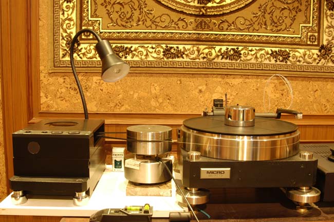 首先测试摩擦系数。给轴承安装了日本套装机唱盘上的转盘,这个只有0.35公斤的铝质转盘因轴套口底面凸出,只有反过来安装(见图-1)。放上频闪测速盘,打开台灯,用手拨动转盘,观察50赫兹33.3测速条为正速时开始记时……1分钟……5分钟……10分钟……15分钟,完全静止时是25分钟!!这是一个令人吃惊的数据!平时不善于喜形于色的我也挥起拳头为自己叫好!激动之下拿起电话给一位烧友,请他立刻将松下1200MKII的转盘拆下送过来。1200转盘的重量是1.7公斤,同样原因转盘只有反面安装在空气轴承上。重复上面的测试过程。由于转盘质量的增加,惯动量随之增加,运转更长时间是必然的,但究竟能有多长还是个未知数,……1分钟……5分钟……耐心等待……10分钟……25分……35分钟,哈哈!完全静止时是55分钟!!!