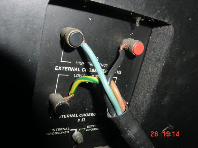 如果你沒有外置的分音器,小旋鈕當然要指向internal crossover(內置分音器)。另外接線只接下面兩個就可以了, 因為上面的一對接口是使用外置分音器時連接高音單元。