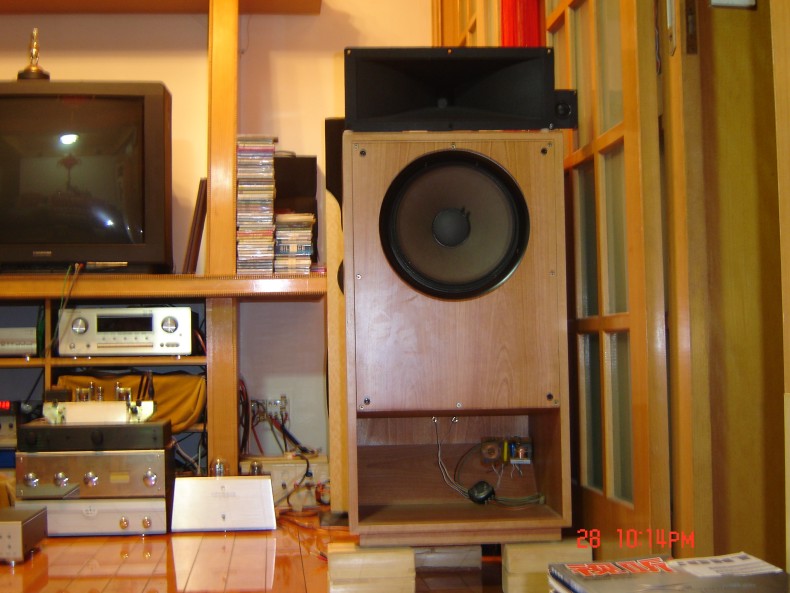 全套JBL原装(含分频器),2416H+G125B-8+原装分频+丝膜高音补偿,箱体为折叠号角,声音也大气从容。