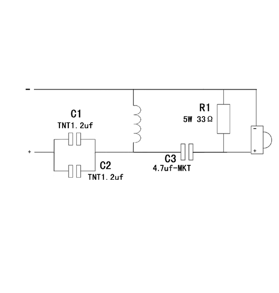 我用的铝带高音,今天两只全烧了,很痛心啊,真的不知是怎么回事了。高音的分频器如图,帮帮我啊,谢谢了!!!