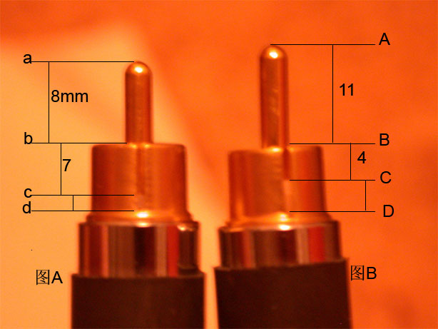附图为刚从赵生处所购NBS Black label 数码线的插头(图B),与标准插头的比较,图中可见此头比标准头多伸出约3mm,这样插到转盘时只能插一半,不知为何这样,怀疑为假线,与赵生交涉,赵生信誓旦旦说此线为陈主编所有,绝对是真线。并说国际标准就是这样。各位玩音响多年可以看到,此头根本不标准。我也不愿相信此线是假线。如果作假用这样的非标准头,那作假水平也太低了。赵生说所有的黑牌都是这样。有无见过黑牌的朋友?证实一下是否这样。另外提醒一下发烧朋友,虽然JS信誓旦旦说,如假可以退货,实际上不管真假,他们都有理由不退你。