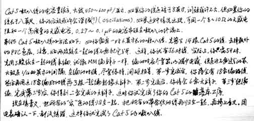 (作者:烧录一族 时间:2002-10-31 15:14:03)- 我以前做过,大致的方法是,剪多股(多少自己定),编紧一些,然后用避震网套上,接线是一定要把色线和白线分别编在一起(这是关键),接上音叉,Cat5+线中我用过IBM的线最好,只是比较贵,而且不太多见。