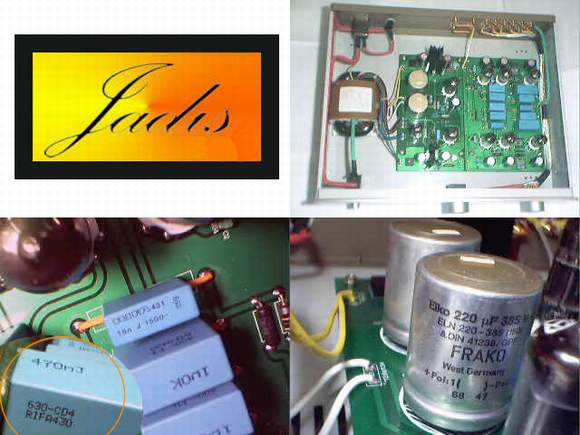 1983年创立的法国真空管厂家JADIS,设计者JEAN-PAUL CAFFI本身是一个对音乐很执迷的人,对现场音乐的物理特性非常了解。他坚持维系品牌纯A类、真空管偏压自动修正、三极管推挽放大一贯的特色,产品保有法国人一贯的浪漫传统,无一不体现精美尊贵。JP200是JADIS推出的极受欢迎的旗舰前级,它由两级共阴甲类及一级直偶阴极输出器组成了主放电路,同时为了使电路的动态更宽,抗过载更好及令电路更稳定,在输出端和输入级电流反馈处引入了负反馈,因此双重负反馈可令失真很低,放大器有极高的指标和极好的听感。原装机主放部分全部使用了音色较暖和的12AX7,所以严格来说她的音色跟CAT LS-1风格是不同的,CAT LS-1采用的是6922,而6922是速度快,分析力高,音染少,线性好,高频特性优越的高频双三极管,和6SN7,12AX7相比,6922是属于音响型的胆管,所以在反复对比听感之后,我决定输入级保留12AX7,而第二级和输出器则换上了跟6922特性相似的12AT7,经这样处理之后,音色马上变得清丽,明亮,通透和娇艳,中频非常厚实,低频强劲有力。在交连电容的选择上,朋友们一定留意到图片上的蓝壳瑞典RIFA电容,而且会问为什么不选MULTICAP的PPFX-S锡箔电容。是的,MIT电容的确非常好,它音色高贵华丽,音乐表情丰富,解析力和透明度方面方面有着过人的地方,但其售价也有着过人的地方(以1μ/400V为例,一个RMB280大洋,若在本机全采用那交连电容就两千多元),所以在考虑到用家的承受能力后,寻找一款同样靓声而价位相对可以接受的电容是刻不容缓。在电子市场上徜徉了几天,也抱回了不少电容,市面上比较容易找到的如SOLEN-大S和SCR,WIMA ,各种二手油浸电容等等,在同我的珍藏至宝MIT对比之后,都不尽人意,如SOLEN显雾气较重,WIMA的低频下潜力和声音解析力较差,油浸电容的声音厚度不错,但高频信息量还是令人却步。在一次试着玩的尝试中,把几个蓝壳瑞典RIFA电容换上,在通电开声时,吓我一大跳:惊喜地发现其声音表现是音场宽大,中频丰富,低频弹跳力好,凝聚力优秀,声音密度高且有较好的份量感,也许是塑壳电容的缘故,其高频的纤细感比MIT还好了一点,而量感并不少,总之音色尽显高贵华丽——哇噢~~!就是她!我如释重负!此机的电源部分采用漏磁很少的R型变压器,胆味较浓的6Z4作整流,12B4A和12AT7作稳压调整,这都是常用的保证音色暖厚甜润的电源电路,很多胆机高手都驾轻就熟,不值多说,我想再罗嗦一下电源滤波电容的选取:在此位置上较常采用的有高耐压薄膜电容,纸介油浸电容,优质彩电电解电容和音频专用高压电解电容等等。薄膜电容的充放电速度快,可声音却显单薄和急匆匆,而纸介油浸电容的涟波电流较大,用较小的容量就能得到厚润和迅态不错的效果,但其低频的下潜度稍差,而且其充电电流过大,对采用胆整流的电路不利,会缩短整流胆的寿命。较为经济实惠的优质彩电电解电容在要求不高的时候可以采用,声音比较中性,一就是一,二就是二,没有多大音染,但音乐味大打折扣。最奢侈同效果最好的当然是用音频专用电解,但要选漏电电阻在15M以上和涟波电流大的品种,我选了德国的EIKO-FRKO超级靓声电解,此电解的速度感相当不错,跟极具胆味的整流稳压可说是天仙配。其他如采用FR4材质的双面镀金PCB线路板,美国DALE精密及军用级电阻,AB碳素电阻,ELNA音频专用小容量电解,德国ERO小电容,美国银线,ALPS优质发烧级电位器,自带滤波的电源输入插座,稳压直流灯丝供电等等的发烧用料及电路特点,就不想多说了,很多高水平的DIY朋友都对其优点心中有数。