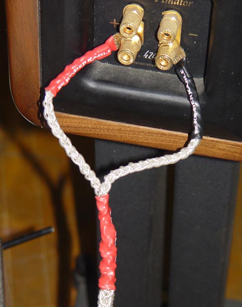 按照照片里的线材, 不能分辨单线的真假, 但整线编织特征与金宝原版似有不同(编织的平均度和编绕角度, 松紧度), 热缩套更是难看之至, 小心为上啊- 金宝的喇叭线里象这种线材包装的只有4AG和8AG, 价格4万以上, 线材是与其纯银信号线一样的, 每条单线里有六支纯银细线, 包覆透明的特富龙材料, 单线的散装单价是每米690元, 如果用金宝原版散装线材DIY喇叭线或信号线的话达到原品的线数和长度的话会比买原厂线贵, 因此很少人会用此线材DIY整线.