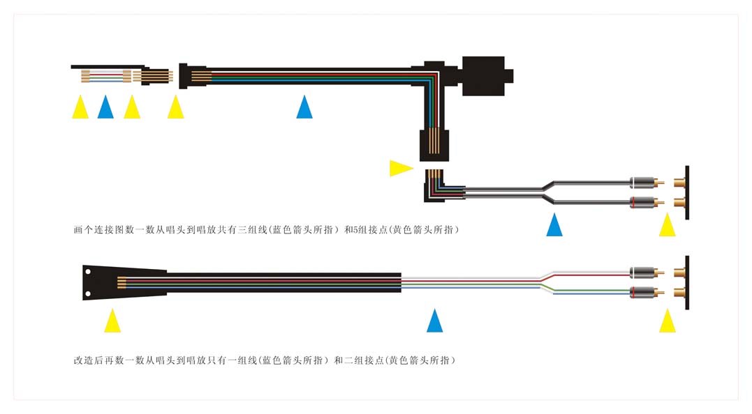 比较之下现在的唱臂线由原来的三组线变为一组,由原来的五组接点变为两组,由原来的普通铜线变为5N银线。音质的改善是必然的,而改善的程度要细心的聆听再作出判断。