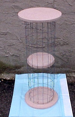 (作者:Jim Wang 时间:2003-08-25 10:16:13)- Here we see the basic framework, consisting of the ends caps, the middle support, and the wire fence wrapped around the inner edge of the end caps and the middle support. Wire fence with closer spacings would be preffered to the wide spacings shown, but this kind can be made to work OK.