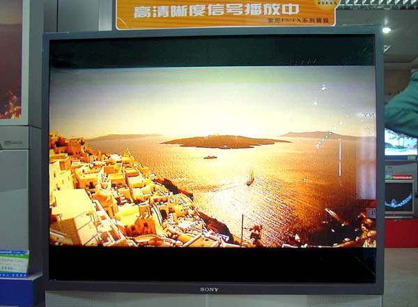 很可惜!我的破100万像素相机无法反映出图象的真实质感层次来.不过大家从现场的光亮度和图象的亮度对比度上比较一下,可以看出,新一代的高清晰度背投的亮度对比度已经非常高了.