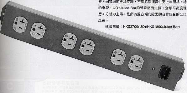美式插座數目而設計的JuiceBar進7寸測試。?娜庋鬯??UOl5A高電流版電源濾波排蘇的內部結構有別於和去年?試的標準版,其心臟部份再沒有採用特殊物料密封式處理,光禿禿無遮無掩,原因為何?不得而知。資料指出,UO排蘇具有濾波、抑噪、防干擾、儲能與及近乎完美的傳輸性
