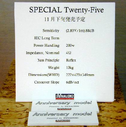 这几天不巧、要陪客人,失去了细细听大展的机会,不过忙里托偷闲去了两次、谈点儿我个人的感受和看法。让我感动的东西倒是有几件,先说第一件---上面图里的DD。大家一眼就能看出那对箱子是1.3SE、或是MK-II了,其实大家都错了,它是单拿25周年的纪念版---Dynaudio SPECIAL Twenty-Five,与1.3SE不同,下面的图是数据。这么小的书架箱竟有着落地箱般的低音素质,全段平衡相当出色,这与下面要谈到的前级及电源可能有关。据代理商说全日本现只有这一对,定价4500美元,约合55万日元。估计是有意同B&W的S805决一雌雄的,谁是雌、谁是雄永无结论的,单拿党也好、B&W派也好,还是自己去寻求结果吧。。。哈哈。