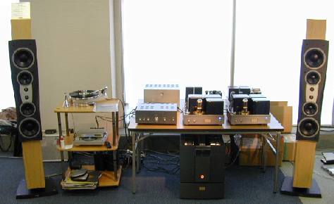 再说说上图里泛着金黄色的长方体,单拿党派的朋友可能会知道---它是单拿公司在厂内校声用的ARBITER前级及电源(代理商是这么说的),后级是Mirad SRA-M20和SHARP的SM-SX100轮换试听,论速度、动态、解析力等SM-SX100没的说,论质感、味道、音乐味SRA-M20略胜出。