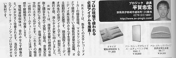(作者:penpie 时间:2002-08-26 00:28:46)- 上面这件产品是这个月日本音响杂志audio accessory上介绍的东西,他们的产品介绍是这样说的:"负离子发生器改善音响环境的效果是惊异的,这是音响理论完全没有接触的现象,室内空气自身的性格和水准会改变。",还说能保持人和器材的健康。我觉得这是瞎掰。