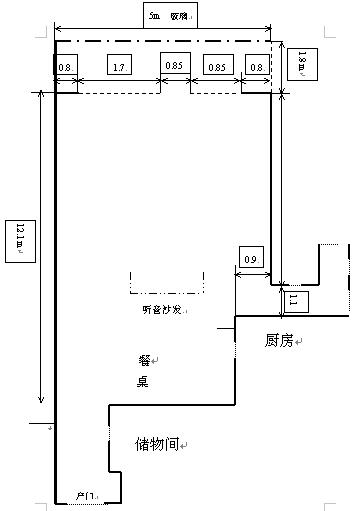 虚线为玻璃,玻璃没有办法加窗帘吸音,因为要采光,现在房间较大较空,拍掌有较长时间的回音,人在里面说话都嗡嗡响!