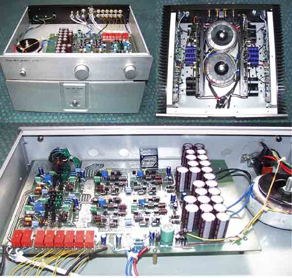 靓声同样以靓料为前提,我不苟同某君在电台上吹嘘自己代理的某品牌,只用普通便宜的零件就做出HI-END级的音响(曾在去年的花园酒店音展上拜会过它,可惜它只以陶街里的低价功放去掉音调后的音色示众,真是贻笑大方),在这套机里我除了大量采用发烧电阻外,还采用了全新ELNA高速电解做前级的电解阵,德国绿ERD,WIMA及蓝PH的小电容,原装ALPS蓝壳音量电位器,东芝音响专用低噪小功率管,A1358/C3421中功率管名管,十二对误差3%的C5200/A1943原装大功率管(挑这24只管时,足足把二十包共500只大功率管都排在了桌上),OPA2604运放两只,八个全新18000µ/75V日本化工电解,四个50A/1000V硅堆等等相对贵价的零件,这些零件不算是世界顶级的,而是根据它们的特性而选用。