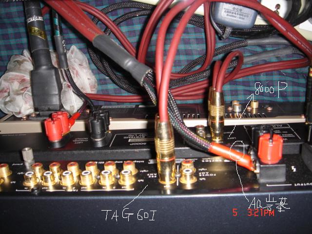 我是用TAG60I推高音,8000P推低音,音像为PROAC2000S。图是我俯拍的,大家帮我看看我的线接的对不对啊??!!特别是喇叭线。。。。