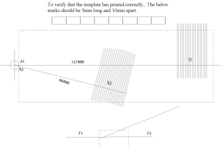 (作者:Jim Wang 时间:2004-09-27 02:57:26)- 打印纸要用好点的,比如24lbs以上的,以避免不精确。这个量规是我改造过的。在这个图的上部有八个小格子,这些小格子是5mm高,80mm总长,每小格是10mm。这些小格子是用来判断你的打印机是否精确。打印出,用比较好的尺来量一下。如果80mm和你用尺量的差不到1mm,那你的打印机还是比较精确的。多于1mm,我建议重找不同的打印机。