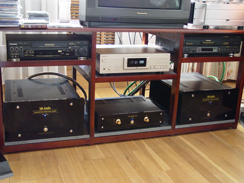 (作者:傻虫虫 时间:2004-01-27 00:33:51)- 台前后级应该是LDH前辈的手笔吧,外形粗圹大方,不过前级还好啦,可是台后级夸张的字体,还有那和与大气外表不协调的扭捏造作的按钮、银钉,怎么感觉土炮味就那么的十足呢…………完蛋了完蛋了,LDH前辈恨死我了