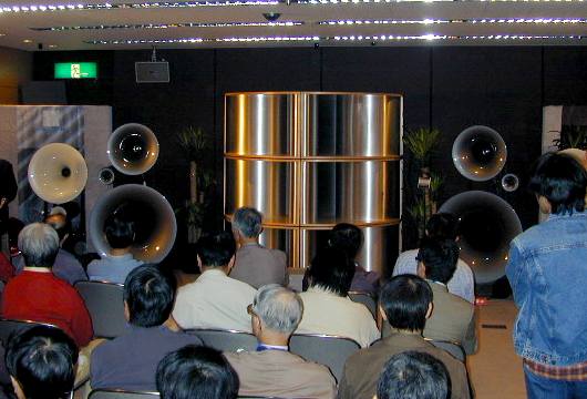 本次的展览中最让我满意的就是以号角为整个系统的美国avantgarde的TRIO-6BASSHORN系统---被称为目前世界上最大级别的号角。由于我几乎是最后到场的、所以也只能站到最后一排了、大约距器材有20几米,就是在这个距离上的听感---空气感和音场也令我大吃一惊!在听以后的讲解和聆听的过程里、多次换位,最终还是座到了皇帝位上。爵士的钢琴、人声,另我兴奋不已!《枯叶》、、、还播了一曲好像是蔡琴的歌(不知曲名),记得歌词里有一句好像是这样唱的---我们在一起共吃了5万顿饭、、、,这是全场唯一的一曲华语歌曲!号角箱子倒是听到过不少、可从来就没有听到过这么逼真的“现场”,一般的来说号角箱表现低音是弱项,但中间的6个低音号角的表现让你五府头地,TRIO号角的直接传递、6BASSHORN的反射递进,烘托的起的气氛与爵士“现场”相当的接近,估计这套玩艺儿在小于200平米的房间里是不会有好的表现的。功放、解码、CD机等都是teac的顶级机。TRIO是需要功