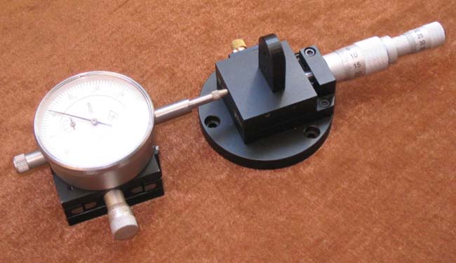 (作者:RECORDS33 时间:2004-09-12 22:29:02)- 下图是唱臂板与唱臂唱头测微调整系统总成。设计制作修改反复近两年,现在总算完成了。直线循迹唱臂不需要补偿角,因此也就没有超前距可言。几何尺寸调整有3项:一是唱针应落于切点,二是垂直循迹角,三是方位角。图中两个单测微头是用于调整唱臂轨道与唱盘底座的平行度;差动测微头(粗细微分头)用于调节唱针落于切点;唱臂座下面是松下1200MKII的VTA调节架,它当然是用来调节垂直循迹角的。这三项调整完毕,再调循迹力(注意,调循迹力会影响垂直循迹角,最好在复查一下垂直循迹角)