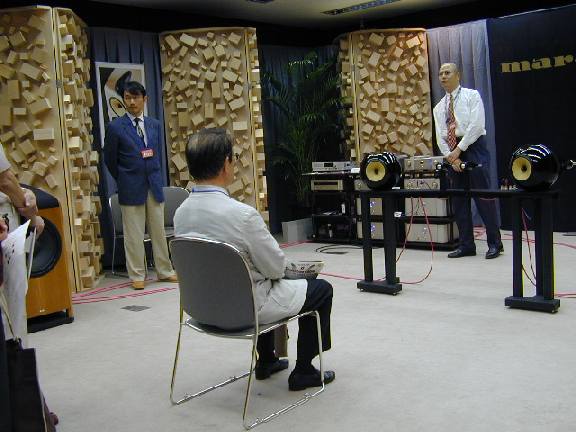 以前也是在这里和其他地方听过由5只N801组成的5.1ch 立体环绕声系统,口水已经流了一地了,当时用的软件可是SACD、DVD/A啊、这次用的就是一般的普通CD,名字忘记了,但内容还清楚记得,有蜜蜂声、蚊子声、蛙鸣流水声、汽车启动驶去声、、、还有一段弦乐曲,大家都知道用2ch立体声技术再现后方的声音是很难的,可就是马兰士的2ch OPSODIS系统却实现了前后、上下、左右的声音三维表现,以至于在听蜜蜂、蚊子声时不由自主的挥手驱走蜂、蚊,免遭蛰刺之苦,拉琴的人就站在身边、琴弓就要撞到你了,触手可及呀,这种感觉只有在多ch立体声系统上方能表现出来的。由于本人也是从玩AV过来的,多ch的相位调整、箱子的摆位、还有音压、功放的搭配、环境调整等等、、、很是烦心,调校得好的2ch立体声系统在声音的表现上可以感觉到有限的半弧线面声音感,但再现后方的声音是很难的,据马兰士的人介绍,现有的CD机、碟片、功放等都可以利用,只需增加一套喇叭和一台“处理转换器”即可,B&W 音箱的拥有者们也可自己改造的(但、不推荐),这样一套2 ch OPSODIS系统,据马兰士的人说并不贵,来年春季就可上市销售,如果真的象马氏所说的那样、价格能够接受的话,就弄上一套玩玩、再园把AV梦!这时不由得想起平时在家里看DVD大片时用的索尼DS8000数码模拟5.1ch 立体环绕声耳机系统,虽然模拟的虚假环绕声音好的还可以让人接受,可马兰士的2ch OPSODIS系统却实现了要由5.1ch 立体环绕声系统方能表现的三维声音,这是否与索尼的数码模拟技术同出一辙???!!!马兰士方面不予答复。在SACD和DVD/A争斗不休、鹿死谁手的动荡年代里,马兰士又推出了2ch OPSODIS系统参与鏖战,是否将打破多ch媒体依赖症的目前Audio僵局、、、大家拭目以待。