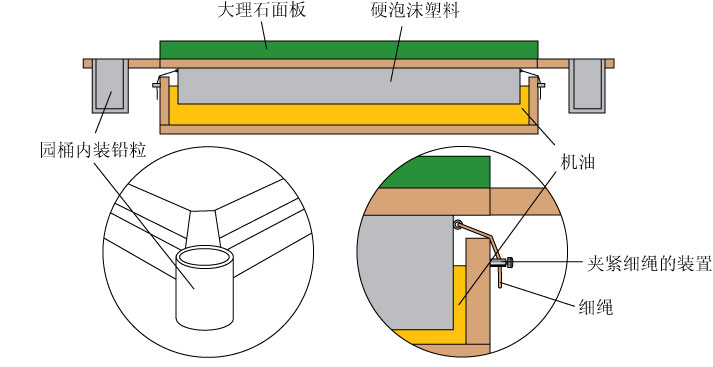 第二个方案就是我这里表达的。这个方案的原理很简单。利用的就是液体自然水平这一现象而达到转盘的水平。大理石面板是为了增加质量。在面板的四个角上装有圆筒。由于每个唱机的重心都不同,在这四个筒内装上不同数量的铅粒从而把唱盘调为水平。在面板的四边,每边各装上细绳及夹紧细绳的装置。这些装置是用来保持面板在中心。从而避免面板碰得装油盘子的边缘。面板下面的硬泡沫塑料是用来使面板浮在油表面上。从避震的角度来讲,面板浮在油表面上也会达到很好的效果。