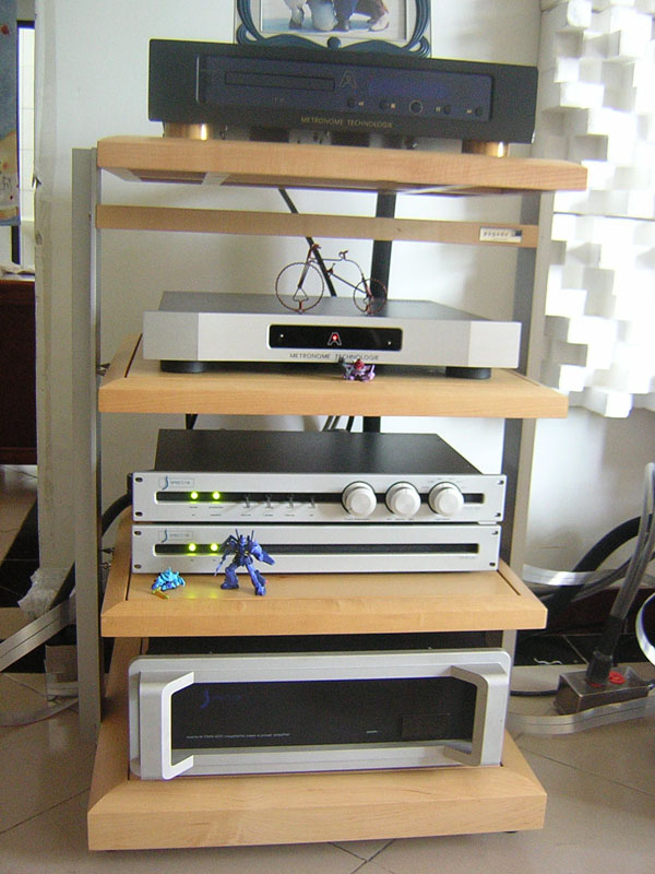 星期六到的,當晚就裝好使用,效果......怎麼說呢,我想花了一萬多很多得到這樣的聲音,說實在的有點不值,不是說它的聲音不好,既有木頭的寬鬆自然,但低音又收的好,完全沒有木架子的音染級混濁,且昨天到朋友家聽他的音響,朋友是用一個仿架皇的架子上面放花崗岩,我只能說Finite Element比金屬架好太多太多了,完全沒有金屬味,聽過Finite絕對不會去想架皇的,但它的價格實在讓我很痛,不過音響就是這樣,好一點點就要多花好多好多錢,這兩天確實有在想這些錢到底值不值得,或許放在昇級器材上會比較好,可是當我再回頭拍照時,看到它整體的外型與喇叭的搭配,哎!!這些錢確實花的值得,買到家裏當傢看我都爽.......