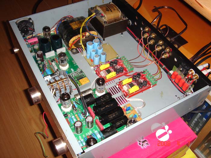 看着大侠们玩的欢,心痒手痒,做了个小功放,前级已就绪,玩的空间主要是小后级.四联级进式电位器是为再加两路左右环绕留下的,也是遥控的.动手能力差,献丑了.