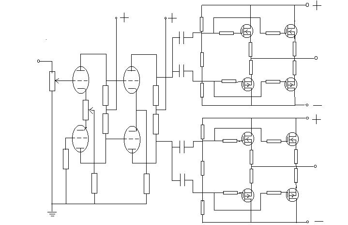 这种结构的到相电路直接驱动后面的场效应管从理论上讲也没有什么不妥,但实际上驱动能力不够,低频慢散拖,虽说场效应管是压控器件,不需要多大的驱动电流,但实践证明这种管子的结电容偏大,等效为在到相级对地并接了一个电容,管子并联越多等效电容越大,到相级负载就越重,高低频两端的延伸就越不理想。作为一种解决的有效方法,可在零DB电流放大级插入一级中功率管的推动级,管子可采用J76/K213。其优点自行分析吧。