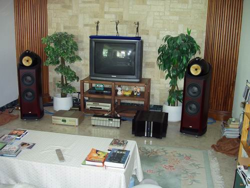 我的房间没有作太多的声学处理,因皇帝位后大约还有7米的不规则空间,低音驻波不太明显,反而音箱位置太靠前低音量感严重减弱,所以箱子后端只能离后墙0。7米,加上电视的影响,损失了音场的纵深表现,这是最大的遗憾!打算改用前投应能挽回一些损失。