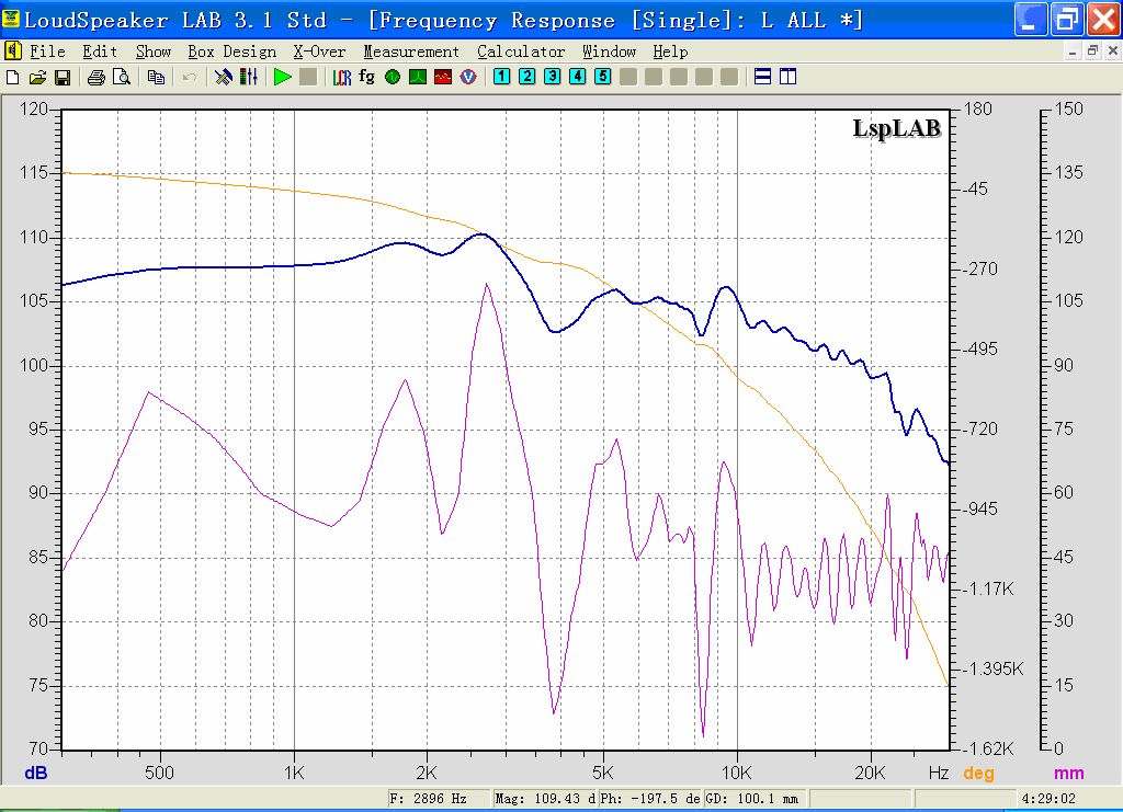 (作者:ldh 时间:2011-08-07 23:12:32)- 首先是环境的因素,这种软件虽然有环境校正功能,但也只是一个说不好的功能,否则的话那些大厂还要耗费巨资建什么消音室?其次是测试话筒的摆放位置距离等,虽然都有一个大概的范围,但是实际测量时出入很大,话筒的指向角度,以及高度都明显的影响到高频的曲线。不信你把话筒指向高音单元再测试一下看看曲线如何。