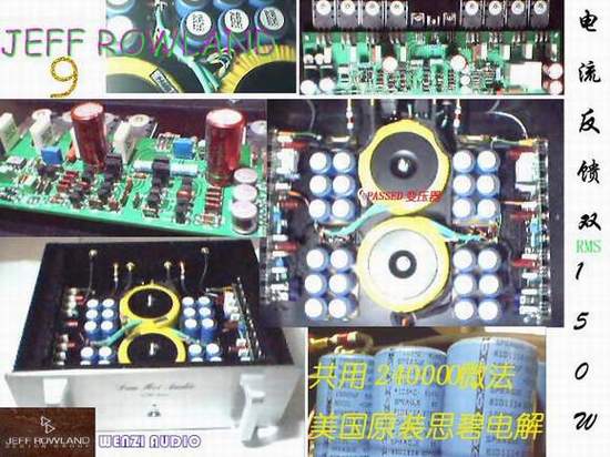 后级方面,线路取材自JEFF ROWLAND model 9。众所周知,乐林是相当有名气及公认靓声的超级贵价品牌音响,在较早期的功放机种中,电压放大部分是采用两块技术保密的密封式厚膜电路,我有幸在一次维修当中碰上了两块没有作密封处理的“大饼干”,如获至宝地对其内部线路进行了仔细观察,发现它是由很多自编型号的IC组成的复杂电路,没办法,洞悉不了奥秘,但一直耿耿于怀。乐林型号较新的功放中,一改以往的保密风格,令人欣喜地悉获了线路,其声音风格跟旧型号大体差不多,而且过于斯文的坏脾气有所收敛,声音令大众更加受落。在剖析了一番大名鼎鼎的乐林功放线路之后,仿制了这台电流反馈型甲类功放。大家知道,电流反馈型功放的闭环增益与闭环带宽无关,在不同增益条件下都有很好的频率响应,而且其开环增益随闭环增益的提高而提高,因此能较好地兼顾非线性失真和瞬态失真这两项指标,电流反馈型功放的转换速率很高,大幅度的高频信号也仅有很少的失真。这台仿制的JEFF ROWLAND model 9,电流反馈型功放的优点尽显,而且其用料不可谓不猛:朋友在香港帮忙找的PASSED黄色500W环牛,全机共用240000μ(二十四万微法)的美国原装SPRAGUE(思碧)电解作电源滤波,而且用四只50A整流堆两声道完全独立供电,晶体管方面采用了场效应管K170/J74作单端互补输入,电压放大全部用超低噪音响型管2SC2856/2SA1191,推动管为摩托罗拉的靓声管MJE15030/15031,八对功率管为东芝靓声大功率场效应管K1529/J200,小电容为德国ERO,小电解为音响专用ELNA,电阻在输入和电压放大级全部用上了东京光音片状电阻,推动/电流放大和喇叭保护部分用上了美国DALE CGW电阻,功率管射极电阻为5W的无感电阻等等,