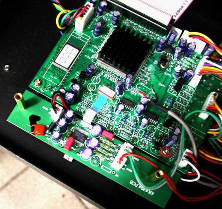 图中清晰的看出铁盒里有两块线路板。上面的大板原本就是完整的ESS方案的解码板,中间那块带有铝散热片的是解码芯片,左边那块贴着“DG-DVD”的贴纸的芯片是可升级软件的程序FLASH,右下角有三片音频DAC和三片运放及其外围电路的位置,其中最左边的音频DAC位置被一个白色的柔性电缆座所代替,三片运放及其外围电路没有焊器件。四个电阻把右边两块音频DAC的四个输出(环绕、中置、重低)跳过没焊的运放,传到后面的AV输出板。柔性电缆把连接音频DAC的IIS总线、复位等口线连到了下面那块小板。大板右边是拆去的AV输出插座和用于六声道静音的三极管位置。AV输出插座位置有个八芯线扎插座突兀的立着,估计板下飞线一排。下面那块小板中就是度高强力宣传的AK4394音频DAC,IC右边三个电容是三洋OS-CON电容。