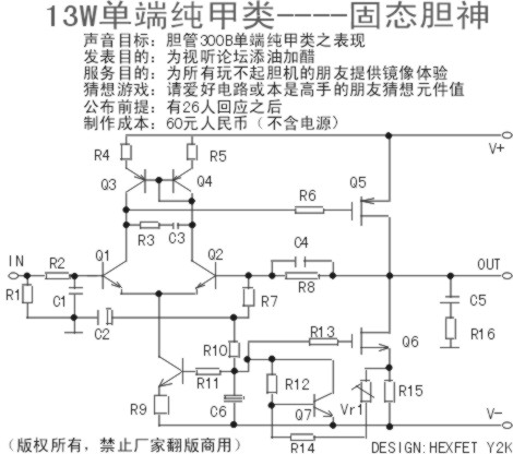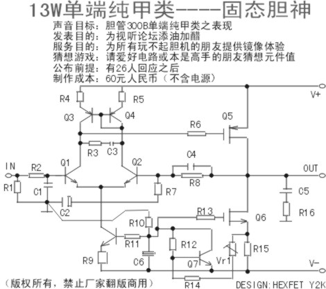 如果你说不影响整机的输出信号,我到要劝你找本教科书看看。别提“R7和C2的接法太常见了”,因为你是在与PASS比,而不是你认为的垃圾电路。- R7、C2串联电路的复阻抗是频率的函数,是根据频率变化而变化的,而且还会产生相移,你把他并在接受反馈信号Q2的基极接地,肯定以非线性的方式分流反馈信号的,反馈信号就失真。你提到可以加大C2,你难道不知道,电解电容,容量越大,它的电感值也越大?那你傍路电路就成了R、C、L的复变函数了,失真就更大了!至于再加上其它电路,那是另一会事了,因为你完全可以把它全部推到,一切重来。