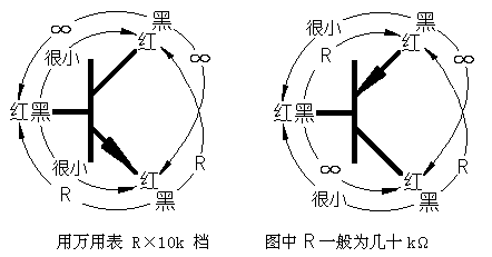 将图看明白,你就会确定三极管的ebc了,注意要用机械式万用表,并且一定要用R×10k档,如果表内电池是15V以上的,则绝大多数三极管符合图中特点,如果是9V的电池,则有些三极管的反向电阻都是∞,不容易判断出e和c极,应用它法。