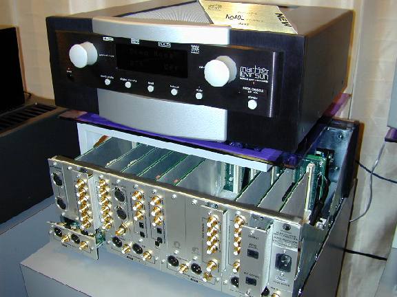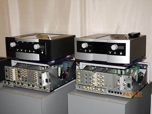 no.40 media consle也采用4个最新版sharc21065L dsp(更快速,面积却只有大拇指的指甲般大小,比以前的sharc小了好几倍)来处理各种环绕声,AD1853 D/A 解码晶片,HDCD解码(软件编程处理),pcm数码输入先升为24bit再做8倍升频处理(24bit/352.8khz, 24bit/384khz)。Lexicon mc-12没有hdcd解码,也没有升频。前年的no.40展示的时候,面板都打有Logic7 logo, 甚至其网站上的说明书都显示有Logic7处理,但是交货给用户的时候却没有,不知道为何?版权专利?好象Lexicon 与Madrigal都是属于哈曼集团的呀!!