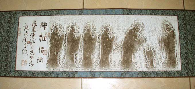 有朋友告诉我,这是汉碑的拓引图,图中是左起第三人是孔子,小孩是传说中问倒孔子的孩子(小儿辩日),左边第一人是老子。 此碑为国家一级保护文物,绝对不准拓印,但这图是千真万确的原版拓印真品。实不知道是如何弄到手的。