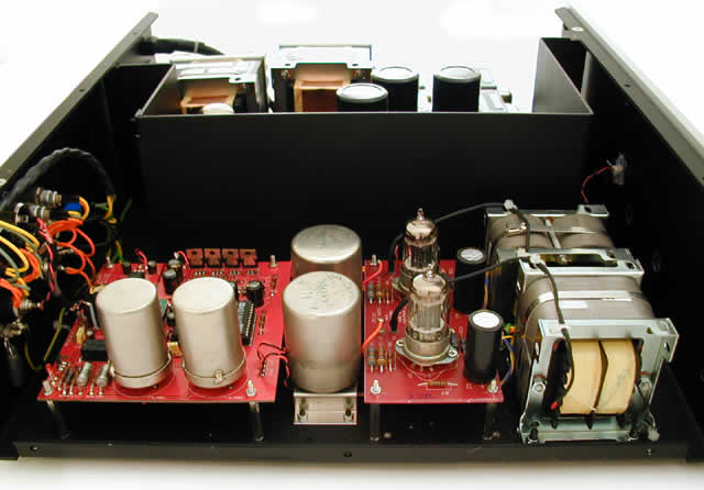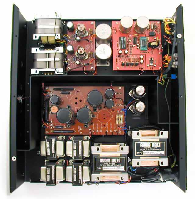 (作者:Roy 时间:2002-03-21 11:44:00)- 昨晚与Wyatt兄研究了一通,此DD图中间的两只硕大的类似铝壳电容的物体原来不是电容,乃是Audionote之独门秘技I/V转换牛!DAC芯片输出之电流直接经此牛变换成灯胆的推动电压,灯胆输出再经过两只硕大的(对DAC输出级而言)30:1输出doube C-Core牛直接作平衡推动,信号不经电容(两黑色电解为灯蛋退耦电容),并将输出阻抗降到1/30(只数十ohm).