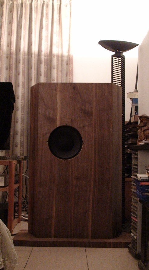 一直以来,我是一个专业器材的拥趸,专业功放可以满足既少花钱又能享受到HIFI效果的满足感,但对于专业音箱好像很难找到既省钱又能搬回家里HIFI的最好选择。其实专业喇叭有很多声音非常迷人的,有些比家用很多顶级组合更让人陶醉,如:玛雅声、D&B、LA、EAW等,可以说令人一听难忘,前几天也听了剧院之声一对十五寸号角专业音箱,那种平衡大气与慑人的音乐感染力令我印象深刻,久久不能忘怀,在民用器材里我真的从来未听到过这种感觉。但专业音响块头大,大部分高中低音箱体独立需要用效果器或电子分音等,需要多功放推动,有些干脆就是有源的,周边配件一大堆,就算你会摆弄,你家里的空间不一定能容得下它,就算你家里能容得下它,你老婆的眼睛也会容不下它,而面积小单个箱体的专业全频音箱,频宽非常窄,两端延伸不足。所以那么多年来都无法实现在家里玩专业音箱的愿望。经常想,如果我会设计音箱那该多好,我喜欢ATC的中频密度与重量感,喜欢西湖的韵味、喜欢同轴音箱那种精准的音场定位,喜欢,如果把所有喜欢的都融进去多好,于是有一段时间我翻了很多关于音箱设计的书,结果我越看越迷糊,本身读书时就是对数理化学习有心理障碍,里面的图形数据与理论让我头晕眼花,原来音响系统那个看似简单的音箱却那么高深,怪不得我的朋友要做监听一号终极版研究了五年,到现在还是在最后定型阶段,所以,所以自己做音箱的事就算了。但我有另一个发现,就是最原始的障板音箱系统,这个好像相对简单,合理的障板比例尺寸已经有专家研究出来,只要你把喇叭装上去就可以了,剩下就是校声了,这可是我的强项与兴趣。网上查看了障板喇叭发现几个普遍问题: 1、 做障板音箱的喇叭频宽较窄,两端延伸不足,只能听中音? 2、 低频量感不足,下潜能力有限,看电影怎么办?我听交响怎么办? 3、 障板面积较大,需要大空间(这个反而不是问题) 4、 全频喇叭灵敏度超高,只适合胆机推动,否则声音粗犷。我可从来对胆机不感冒。另外关于喇叭磁铁也有三类(为朋友介绍) 1、 钢磁,磁力能保持长久,灵敏度高,声音纯净,但动态与控制力不足。 2、 粉磁,磁力强,瞬态反应快,有较好的低频量感与延伸,但磁力容易消失,时间长效果受到影响。 3、 铷磁,比粉磁磁力强十倍以上,同时拥有比粉磁更好的瞬态反应快、低频量感与延伸,同时兼具钢磁的磁力持久,但价格昂贵。经过分析,适合我的喇叭必须是铷磁的,要十二寸以上,另外高音要较好的延伸,意思就是在全频喇叭基础上自带一个高音的喇叭单元,总结起来就是要一个12寸同轴的铷磁喇叭做出来的障板音箱才有可能满足我的要求,但,有这样的喇叭吗?我对障板音箱有个顾虑:喇叭就装在板上有低音吗?印象中喇叭不装在箱子里是没有低音的,它低音延伸能达到我的听音要求吗?但问过朋友说没问题,而且我看见很多钢琴监听喇叭都是半障板式的,一样量感十足,所以决定玩玩障板。我总觉得我在玩音响方面经常是很幸运的(也因为这样浪费我很多时间造成不幸),刚好朋友托关系从海外搞了几对意大利专业同轴喇叭,于是毫不客气抢了一对过来,在网上找了一对按公认合理比例做的进口合板障板,这几天就折腾开来。当听到它的声音后,感觉这么多年的愿望好像有了彻底的转机,之前所有的顾虑根本就是多余的。