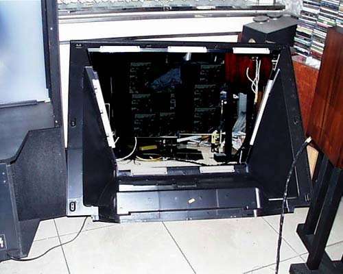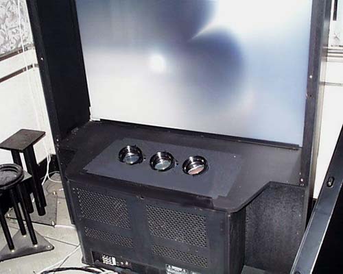 这是背投的三只7寸投影管。投到箱体背后的一面大镜子上,再反射到前面的微透镜“三明治”屏幕上。