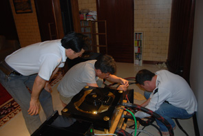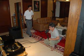 (作者:乐迷 时间:2009-08-04 20:50:19)- 换上台湾烧友自己价值十六万元的喇叭线,感觉系统有何改变,换线可是一件不容易的事,忙活了半天,累出一身汗