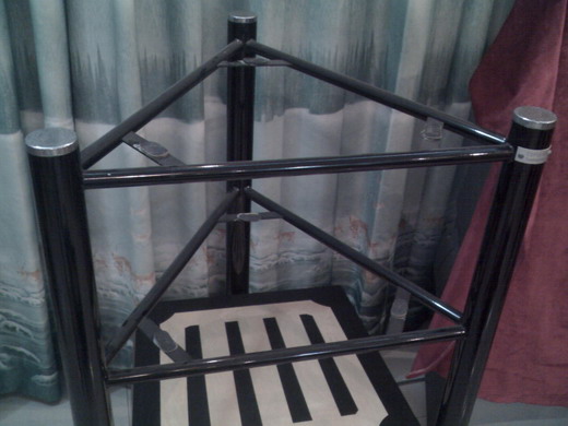 (作者:feng 时间:2009-07-10 22:45:12)- 这架子是三柱的等边三角形的。 连脚钉垫的高度是111CM; 每层的高度(层板与层板)是28.5CM; 三条柱子的距离(等边三角形的边长,即从柱子的中间到另一柱子的中间的距离)是62CM;每层的内平面垫层板的也是等边三角形,边长是56CM.