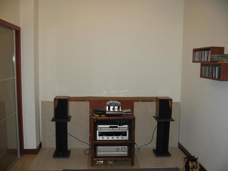 我 的 听 音 室 长 4.3米 ,宽 2.4米, 面 积 10平 米 ,因 为 是 顶 楼 作 听 音 室 ,所 以 屋 顶 有 个 斜 度 的 ,音 箱 上 方 高 约 2.8米 ,听 音 座 位 上 面 是 2米 不 到 ,整 个 房 间 形 似 漏 斗 .最 要 命 的 是 装 修 时 地 板 是 空 的 ,结 构 是钢 结 构搭 架 子 ,再 用 一 层 强 化 地 板 加 9毫 米 密 度 板 加 吸音 棉 加 石 高 板 吊 顶 的 三 明 治 结 构 . 音 箱 后 面 的 墙 是 现 搭 的 ,用 的 是 空 心 的 石 高 板 和 密 度 板 里 面 塞 了 些 吸 音 棉 .由 于 底 盘 和 靠 山 都 很 虚 ,我 现 在 的 系 统 到 了 这 间 屋 子 居 然 没 有 什 么 低 频 了 !以 至 于 我 把 家 里 的 另 一 对 惠 普 双 6寸 半 哑 铃 箱 搬 进 来 也 听 不 到 什 么 低 频 .十 分 地 痛 苦 .后 来 用 装 修 剩 下 的 80*80的 地 砖 铺 在 地 下 和 靠 在 音 箱 墙 背 后 ,总 算 是 有 了 些 低 频 .现 在 我 想 作 些 改 建 ,请 大 家 赐 教 行 不 行 得 通 .方 案 如 下 :音 箱 背 后 的 墙 用 墙 面 砖 重 新 铺 满 然 后 加 一 对 扩 散 板 ,地 板 就 用 这 4块 地 砖 铺 在 音 箱 下 面 凑 和 一 下 .这 样 可 以 吗 ?