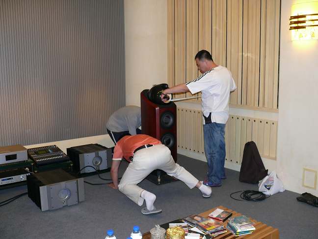 放上一段由前苏联作曲家谢德林的芭蕾舞音乐“卡门”,这个音乐采用了大量的打击乐器,用来检验音响系统的瞬态反应和质感还是不错的。这一听,还真的发现了问题,大鼓的位置不对了,而且定位飘忽,赶快停下来检查。老赵的这对802D是用两台PASS的350功放来驱动的,原先只用一台,老赵感觉不太满意,前一天特地跑到沈阳,将HK公司吴总的另一台PASS350也搬了过来,用双功放来推,由于时间匆忙,临时做了两条一分二的音频信号线,是不是这两条信号线有问题。经过检查,并没发现错误,于是先用一台功放来推借以判断,结果现象依旧。哈市老杨和鹤城老黄对音箱的摆位提出质疑,认为音箱的位置过于靠前也摆的太宽。老杨根据听音室的3D尺寸,计算出音箱的正确位置,大家一起上前,搬的搬,挪的挪,这HI-END的东西哪有轻武器,都是重量级的大家伙,虽然室内有空调,但大家也都汗水淋淋。再次开声,哈,这回定位准确稳定,声音也脱离了音箱,音场非常开扬。802D在PASS350的策动下虎虎生威,声音清晰通透,动态强劲,像真度很高,不愧是当代一款名器。