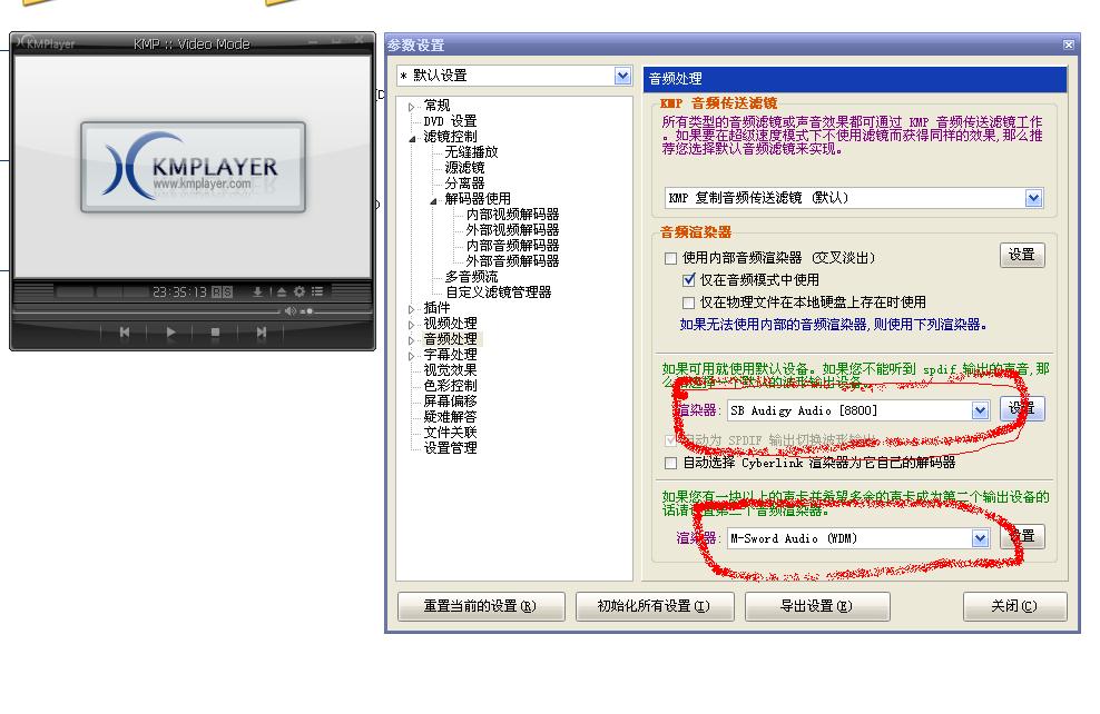 没垃圾了就是清爽,小弟玩声卡上瘾总想在两者间自由转换,这不终于搞清楚该怎么玩,想想双系统的还是烧友多,就发这了,见图听音乐双声道时(数字接解码器)可在音乐播放器中选一输出如千千静听,看AV时在不关闭优秀DAC的情况下可以这么玩7.1,KMPLAYER王牌播放器,在参数设置中选音频处理(见图)来设置双声卡,这样就可以减去很多更换操作!一个设置数字,一个设置模拟(7.1),或两个都设成数字各接解码器同时输出!哈哈,想想看玩法很多啊!
