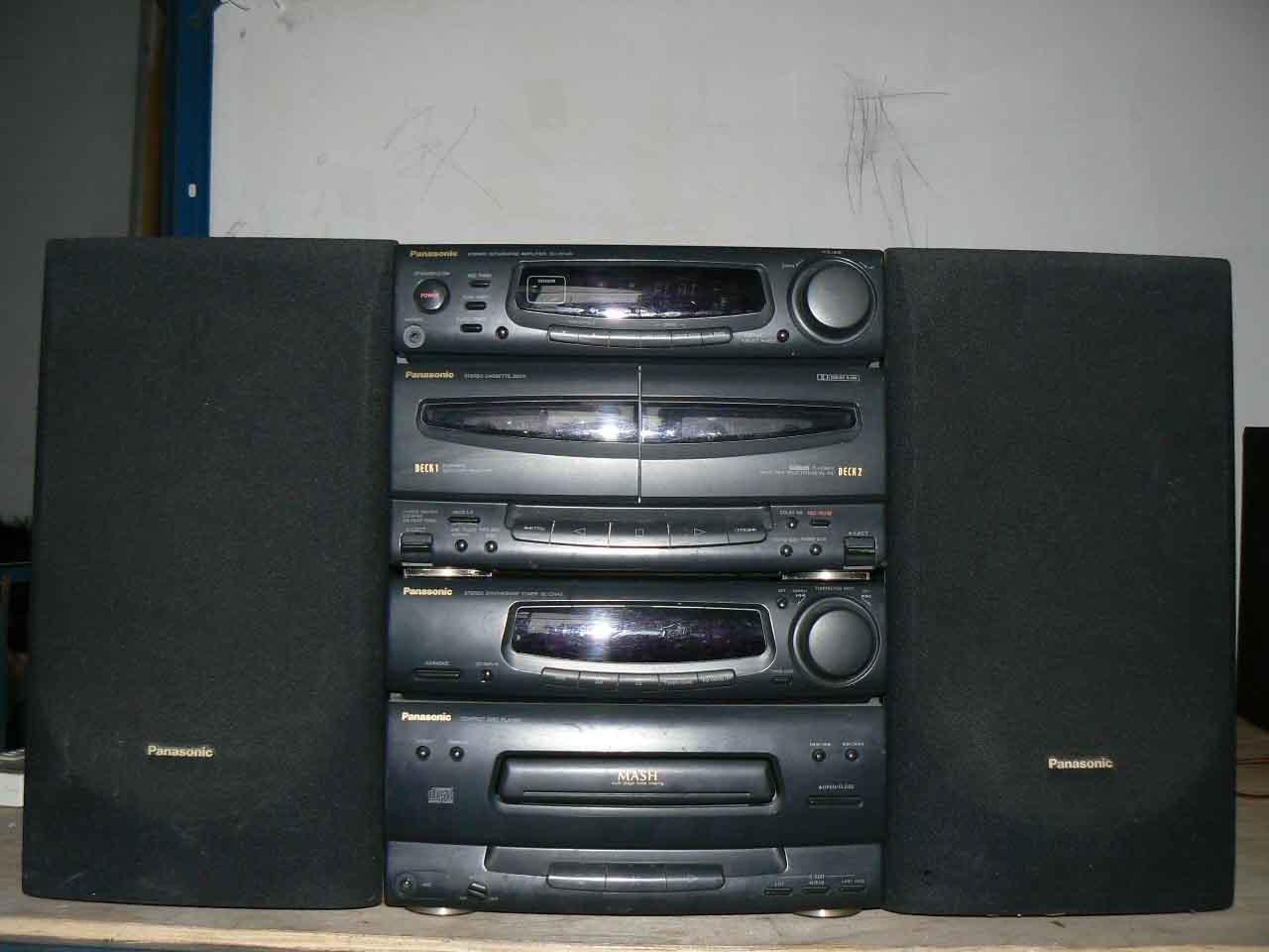 松下组合机,单蝶CD,带收音和卡带,带均衡,松下的机子音质都是很靓的,低音有力,高档耐用.主机分二层,功能正常!