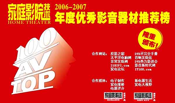 在广大读者及业界人士的强烈关注与大力支持下,以“AV TOP100”为主题的2006-2007年度最佳影音器材推荐榜推出了。这份榜单是以年度最新影音产品为重点范围,经《家庭影院技术》杂志社精心策划、专家组严格评选,并得到多个著名影音网站的共同协作而最终形成的。它的核心目标是为读者与行业提供一份真正具有参考价值与指导作用的榜单,一方面肯定与表彰优秀的品牌、产品及技术,另一方面让消费者能在琳琅满目而又鱼龙混杂的影音市场上方便的找到真正称心如意的产品,让影音生活更惬意,同时也是高品质的。