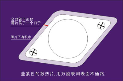 薄片下就有积水了。因没电吹风,我想把那薄片锹开让水出来。结果就段了一个口子。用万用表测试金