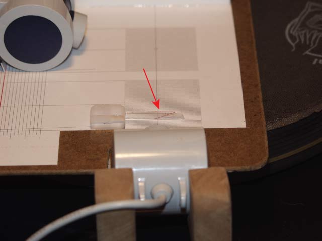 这个摄VTA的Cam的中心要和这个板基本上在同一水平上。图中红色箭头所指之处是用透明的有机玻璃制成的标尺。这个标尺上的线条和唱盘平面成22度。这也是VTA常用的角度。