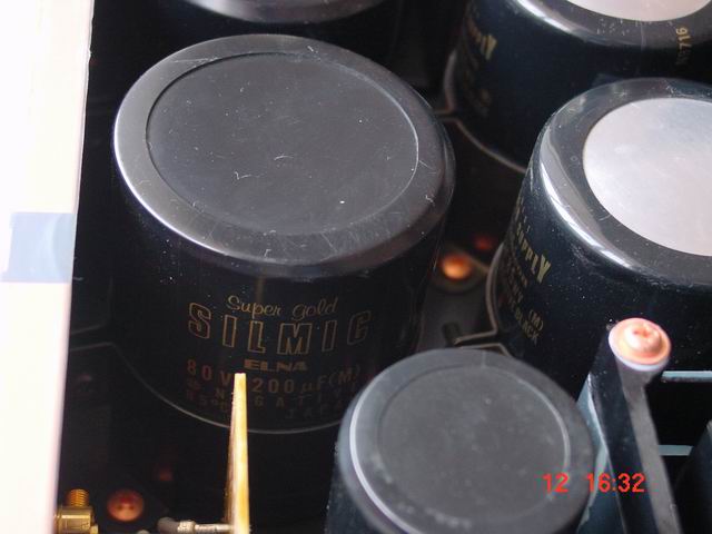 (作者:大海 时间:2005-05-31 21:05:00)- 电容全是ELNA的 super gold,电路板上的小电容也是。注意那对金属白色顶的大电容是椭圆型的。还有椭圆黄铜车制脚加真皮贴片,据HIVI评是为了削弱震动