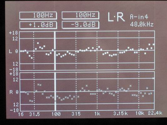 既然这样,我们请出Accuphase DG28,看它测试的情况。3次测试后,用同样的CD碟播放,我们惊呆了:同样的器材,同样的环境,只不过按照Accuphase DG28测后的曲线调整了EQ,交响乐、小提琴、人声起了翻天覆地的变化!4343的声音柔顺起来,原来“很不行”的声音化为栩栩如生、美妙动人的音乐!再看看曲线,犬牙交错,左右声道某些频率竟然相差9个DB,原来是这样差的环境,吓死人了!即使有EQ,不靠仪器,根本没可能调好啊!Accuphase DG28厉害,它把本不看好、环境恶劣的声音,硬是化腐朽为神奇,创出单台功放推4343良好声音的例子!大家知道,玩音响环境影响占相当大的比重,但有了Accuphase DG28,使得我们玩音响克服环境的影响,变得简单了许多。Accuphase DG28好嘢!