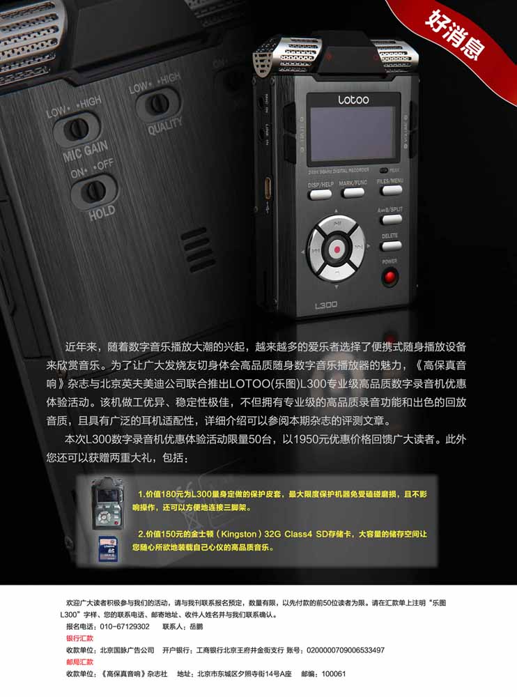 《高保真音响》杂志联合英夫美迪公司联合推出L300数字录音笔优惠体验活动